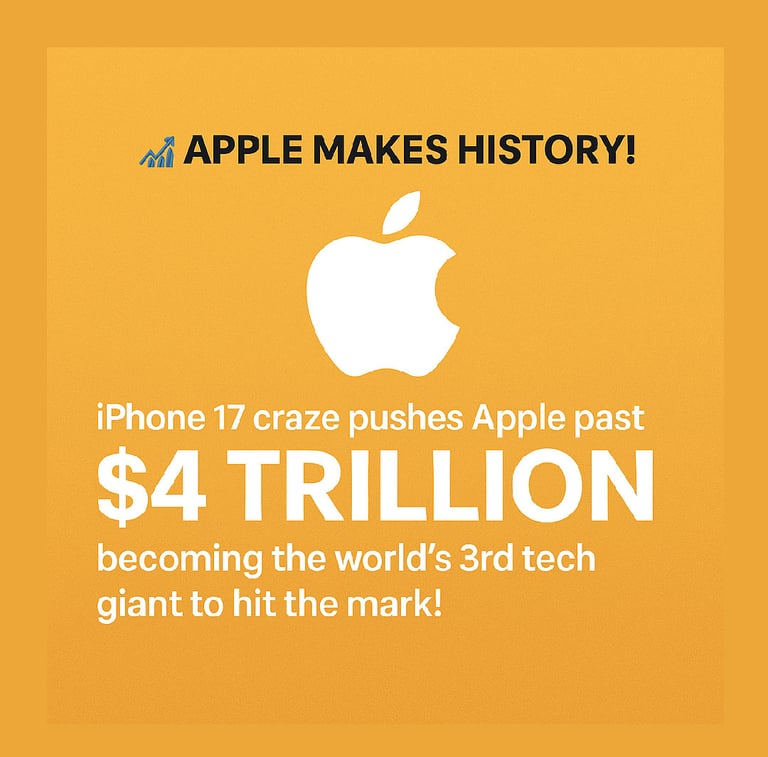 Apple Inc. has once again made history by crossing the $4 trillion market capitalization mark, becoming the third global tech giant to achieve this extraordinary milestone. The surge comes on the back of record-breaking demand for the new iPhone 17 lineup and the ultra-slim iPhone Air, which have reignited investor confidence in the company’s long-term growth.