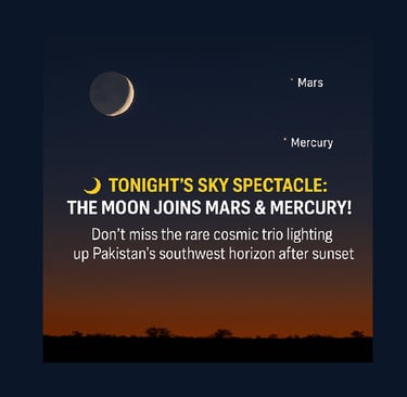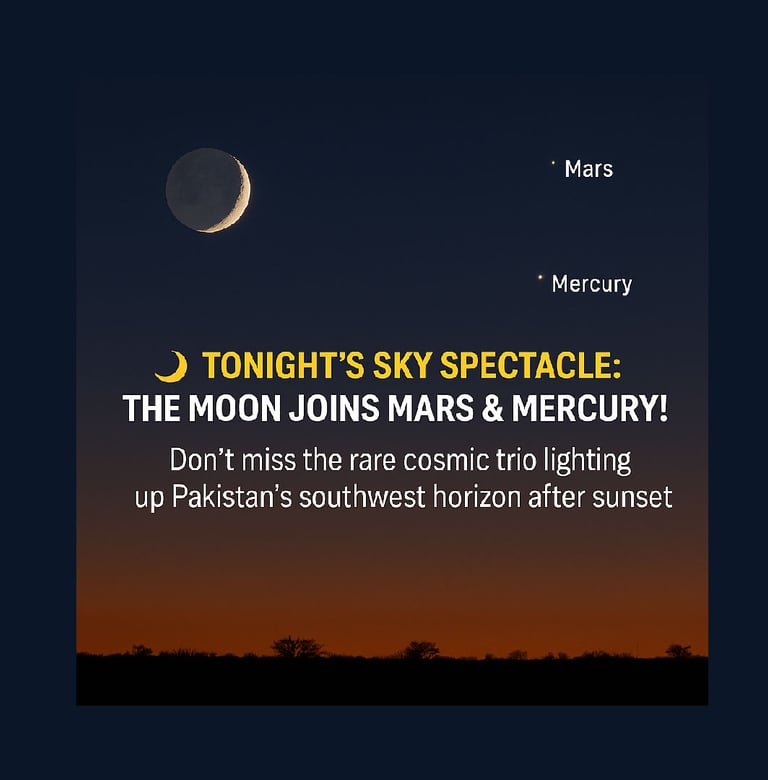 Stargazers in Pakistan and around the world are in for a treat tonight, as a delicate crescent Moon draws close to Mars and Mercury in the evening sky. The rare cosmic trio will appear just after sunset — but you’ll have to be quick to catch the view before they dip below the horizon.