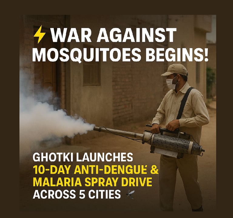 The drive covers five major cities of Ghotki district — Ghotki, Ubauro, Mirpur Mathelo, Khangarh (Khanpur Mahar), and Daharki — where mosquito repellents are being sprayed inside homes and along residential streets to eliminate mosquito breeding sites. To strengthen the effort, larvicides are also being applied to stagnant and contaminated water sources such as drains, ponds, and ditches to prevent the development of larvae.